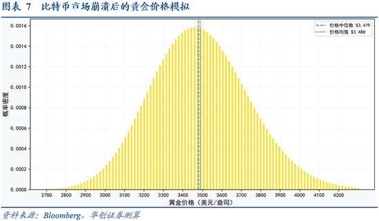 我们采用2025年2月底的比特币市值数据,黄金市场日均交易量采用2024年的日均交易量均值,黄金市场的总市值用2024年2月底的水平。通过测算可以发现黄金价格中位数为3479美元/盎司,而黄金价格90%的置信区间为3088-3919美元/盎司。