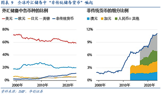 美元作为全球储备货币的统治地位或面临结构性瓦解。截至2024财年,美国公众持有的国债规模达28.2万亿美元;美债净利息支出达8810亿美元,已经超过国防支出。这种不可持续的债务路径引发各国央行对美元信用的担忧,美元储备货币地位或将迎来松动。尽管短期内美元指数维持强势,但是美元在中央银行和政府外汇储备配置中的比例正在逐渐下降,与之相伴地是人民币等“非传统储备货币”比例的上升。