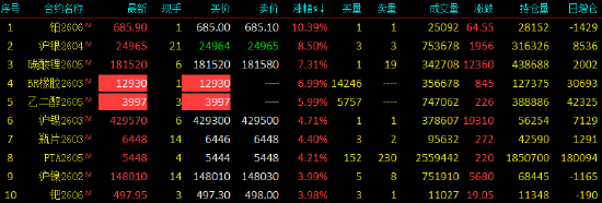 2026年1月23日,国内期货主力合约多数上涨。铂涨超10%,沪银涨超8%,涨超7%,封涨停,涨幅6.99%,封涨停,涨幅5.99%,、瓶片、涨超4%;跌幅方面,SC跌近1%。