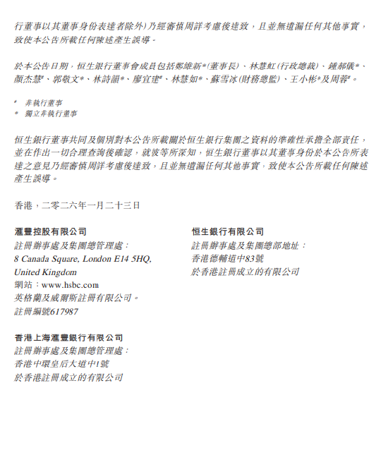 1月23日金融一线消息,恒生银行公告称,私有化计划于2026年1月23日(星期五)举行的法院聆讯中获香港高等法院认许,未作任何修订。股本削减亦于同日在同一聆讯中获高等法院确认。计划预期于2026年1月26日(星期一)变成具约束力且生效。于计划变成具约束力且生效后,将另行刊发公告。恒生银行已向香港联交所申请,而香港联交所已批准撤销恒生银行股份在香港联交所的上市地位,自2026年1月27日(星期二)下午4时正起生效,惟须待计划变成具约束力且生效后方告作实。