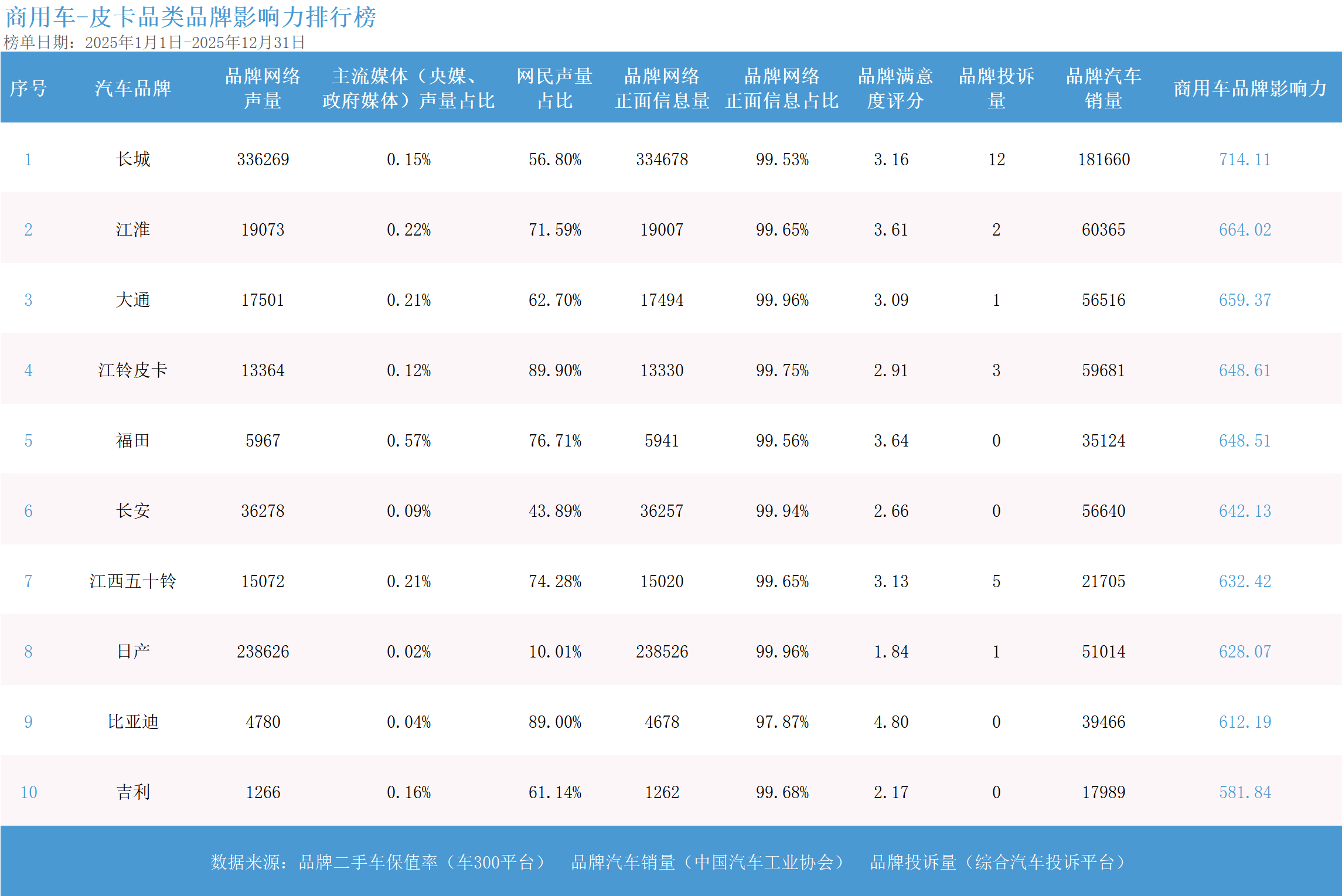 在皮卡、轻卡、轻客等其他商用车细分领域,领军品牌则凭借数十年如一日积累的专业口碑、对细分市场需求的深度洞察以及对应用场景的极致深耕,构建了其他品牌短期内难以逾越的竞争护城河。