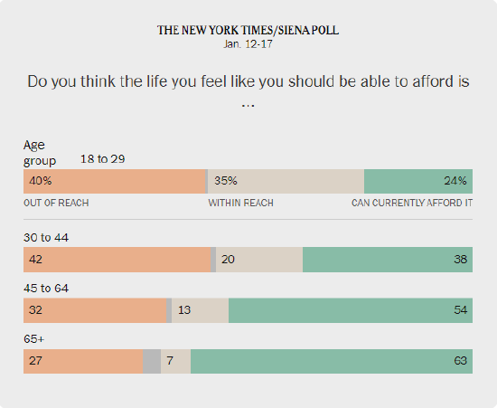 近三分之二的老年选民表示,自己能够负担得起中的生活;而在 30 岁以下的选民中,高达 75% 的人表示,理想生活对自己而言遥不可及。