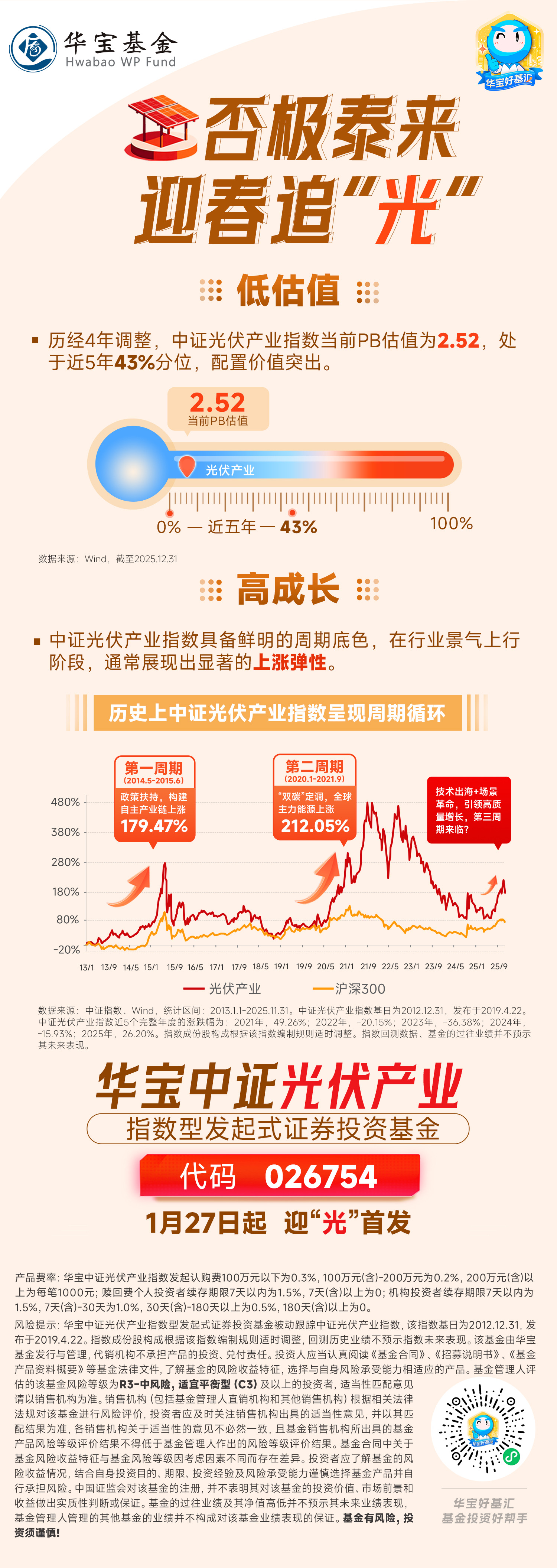 历经4年左右时间的调整,如今,光伏板块的配置价值已较为突出。在这样一个关键阶段,基金公司也加大了对光伏领域的投资布局。今日(1月27日),“指数投资大厂”华宝基金旗下——华宝中证光伏产业指数基金(代码:026754)正式火热开售,成为参与光伏投资的又一把投资利器。