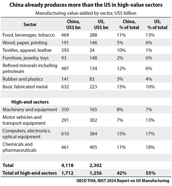 美国统计局把苹果、英伟达这种不碰生产线的设计公司也算成制造业。苹果一个员工创造几百万美元产值,富士康一个工人才创造几万美元。你拿苹果的设计师去比富士康的装配工,能不得出中国生产率低的结论吗?