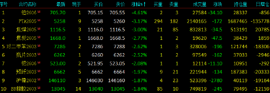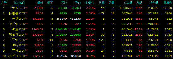 2026年1月27日,国内期货主力合约跌多涨少,铂跌超4%,跌超3%,跌3%,、跌近3%,钯、瓶片跌超2%,、、跌近2%。涨幅方面,沪银涨超7%,油涨超2%,、涨近2%。