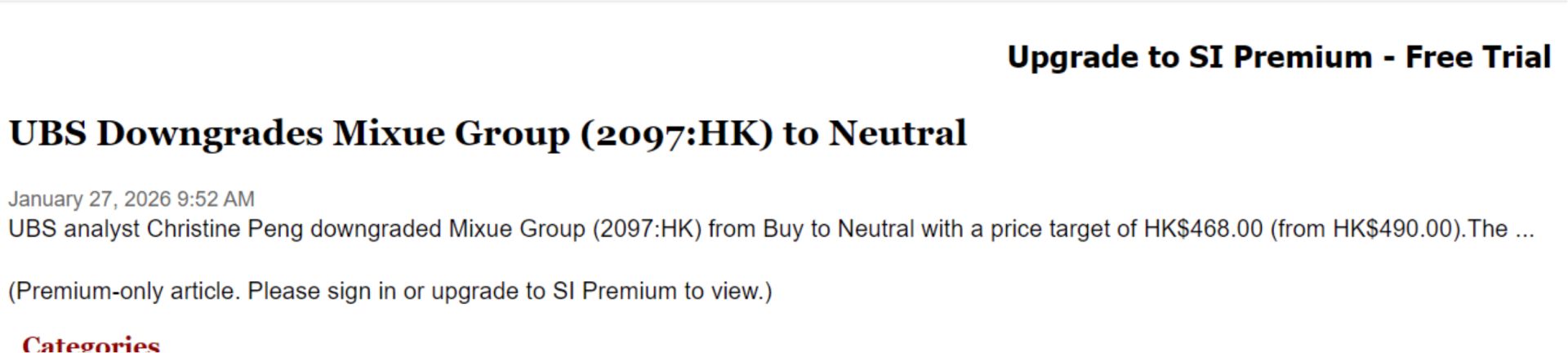 据了解,瑞银(UBS)分析师Christine Peng于1月27日发布研报,将蜜雪集团评级从买入下调至中性,目标价由490港元降至468港元。