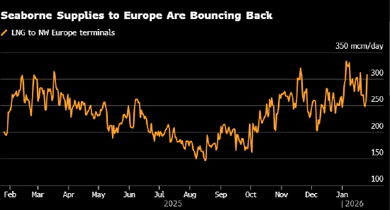对未来几周的天气预报显示,欧洲和美国气温趋势趋于温和,这在短期内可能缓解市场压力并压低天然气价格。不过,天气模型仍然波动较大,许多交易员依然认为2月下旬可能重新出现严寒天气。若寒潮与低风速天气叠加,可能在今年动荡的开局之后,再度引发更剧烈的市场波动。