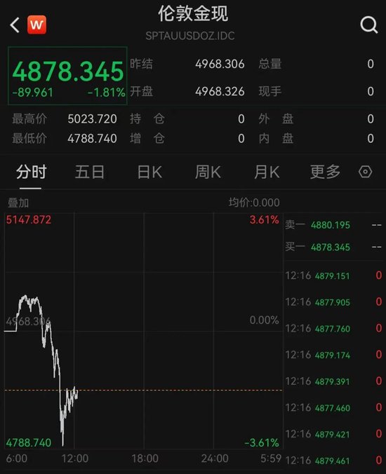 今天上午,现货黄金、现货白银盘中直线跳水,双双重挫。有色金属板块大跌,贵金属板块领跌。Wind数据显示,截至12:16,现货黄金下跌1.81%,报4878.345美元/盎司,盘中最低触及4788.74美元/盎司;现货白银下跌13.35%,报76.847美元/盎司,盘中最低触及73.485美元/盎司。