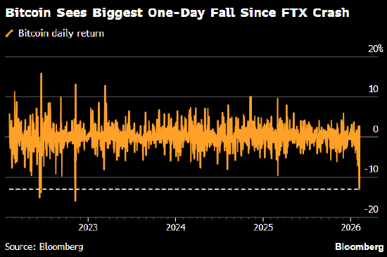 比特币周四下跌超过13%,创下2022年11月Sam Bankman-Fried麾下FTX崩盘以来的最大单日跌幅。在最新跌势中,比特币一度短暂较10月6日在126,000美元上方触及的历史高点下跌了一半以上。