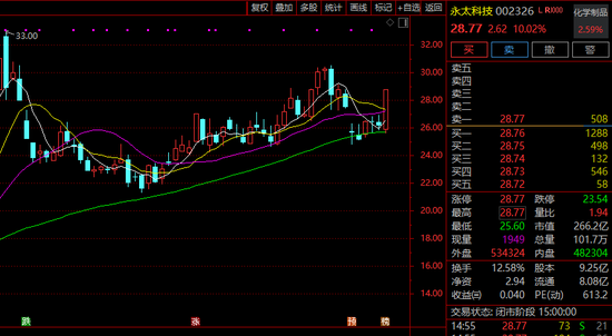 二级市场方面,永太科技已先涨为敬。2月6日,公司股价盘中大幅拉涨,并以涨停收盘,最新报收28.77元/股,市值266亿元。