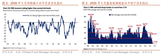 沃什主张的“缩表+降息”可以概括为相对鹰派的宽松态度,理论上将在中长期有利于稳定美元,这对此前市场广泛交易的“弱美元”叙事形成挑战,而全球资本市场已经计入了太多的弱美元和流动性宽松预期,从而增加了市场的脆弱性。一个直观的表现就是全球各类资产表现正相关性提升,风险资产、避险资产齐涨齐跌,全球风险敞口极高,而现金持有水平降至历史低位。根据美银在1月20日发布的全球基金经理月度调研结果,受调研的基金经理风险敞口水平净高出正常水平16%,仅次于2021年高点;且现金持有水平进一步下降至3.2%,为2000年以来的历史最低水平,这些指标都表明在经济好转+通胀担忧缓解+美元走弱的预期组合下,市场整体情绪达到了历史性的极度乐观水平。