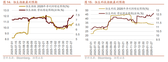 对于近期恒生指数和恒生科技指数表现的分化,背后对应的是两个指数近期盈利预期走势的分化。整体来看,恒生指数的盈利预期近期是温和上调的,这是近期恒生指数更有韧性的原因;恒生科技指数的EPS预期从9月以来持续下调,但目前已经有所企稳,表明当前的股价已经反映了市场对盈利的阶段性下修。