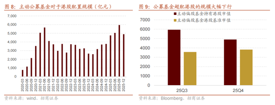 这一叙事在当前得到极大缓解。2025年四季度,主动基金减配港股,截至25Q4公募基金对于港股的配置规模下降至4897亿元;同时公募基金对于港股配置的基准市值有所回升,公募基金对于港股的基准配置规模上行至3817亿元,公募基金超配港股的规模显著缩小。往后看去,超越基准导致的净卖出或将告一段落。