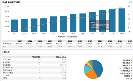 2025年华夏基金营业收入相较于2024年同期营业收入相比,增长19.86%,净利润21.58亿元增长11.02%。Wind数据显示,截止2025年四季度末,华夏基金资产规模22,797.8亿元,,与2024年同期相比,资产规模增加4917.3亿元,产品数量增加72只。
