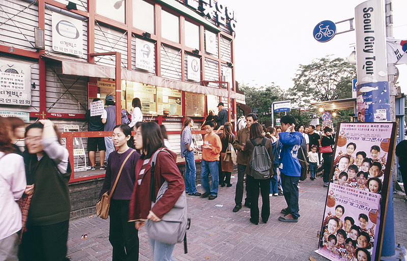 晚上九点半左右,这栋不太显眼的大楼变得热闹起来,人群鱼贯而出,在大厦门前台阶聚集。票根和签字笔是必备物品,也有人扛着相机“大炮”,对准人群中央一个打扮精致的人。