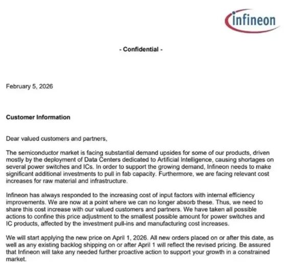 同日,德国半导体巨头英飞凌也发布涨价通知,宣布自2026年4月1日起,上调部分功率开关器件及集成电路(IC)产品价格。