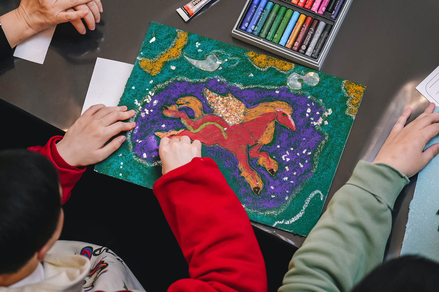 少儿公益艺术大师班以东方“翼马”为灵感,在艺术策展人谢定伟先生的引导下,孩子们将斑斓的彩宝之色赋予象征希望的“翼马”,最终36幅画作陈列于宝格丽宴会厅前厅,汇聚成“意彩童梦”少儿公益艺术展。