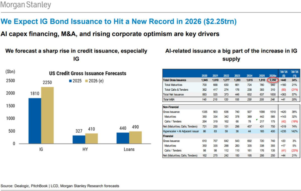 为了维持这种规模的资本开支,科技巨头们可能被迫开启大规模的债券发行狂潮。这意味着,曾经拥有完美资产负债表的科技成长股,正在全面“信用化”。