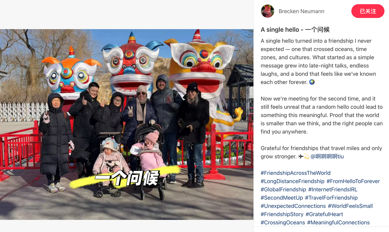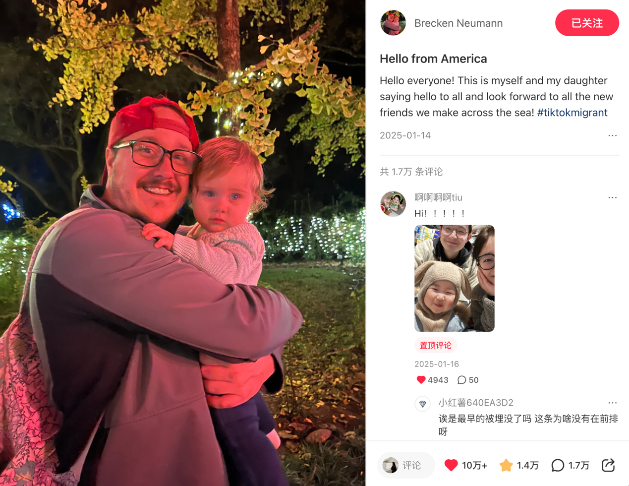 去年1月,大量海外用户涌入中国社交媒体平台小红书,布雷肯就是其中的一位。他上传了一张抱着女儿打招呼的照片和一句“来自美国的你好”,收获十几万个点赞,数千名网友也纷纷在评论区晒出温馨的家庭合照。