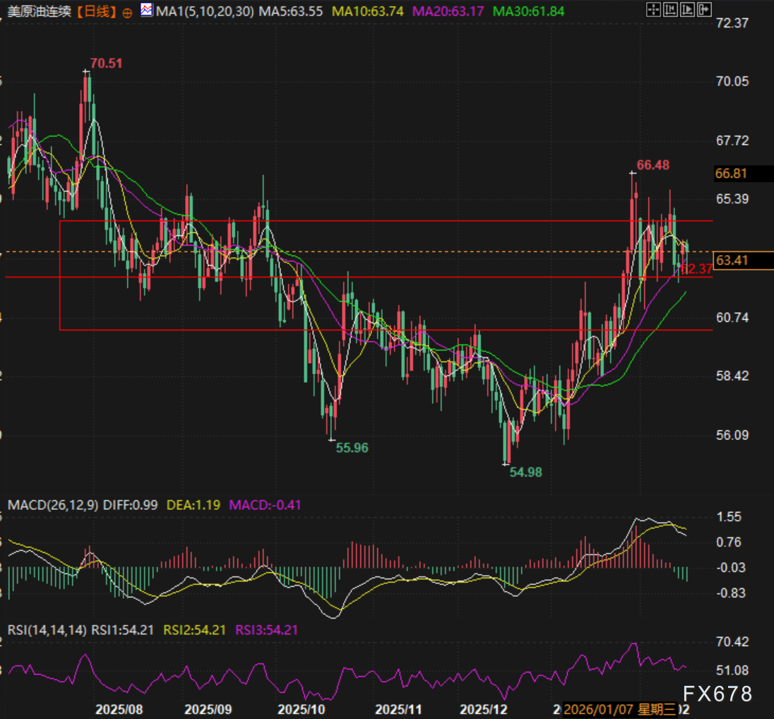 技术面上美原油连续自底部持续反弹,依托箱体进行突破上涨,目前在箱体上半区域整理,62.37是近期支撑,压力位在64.58附近。