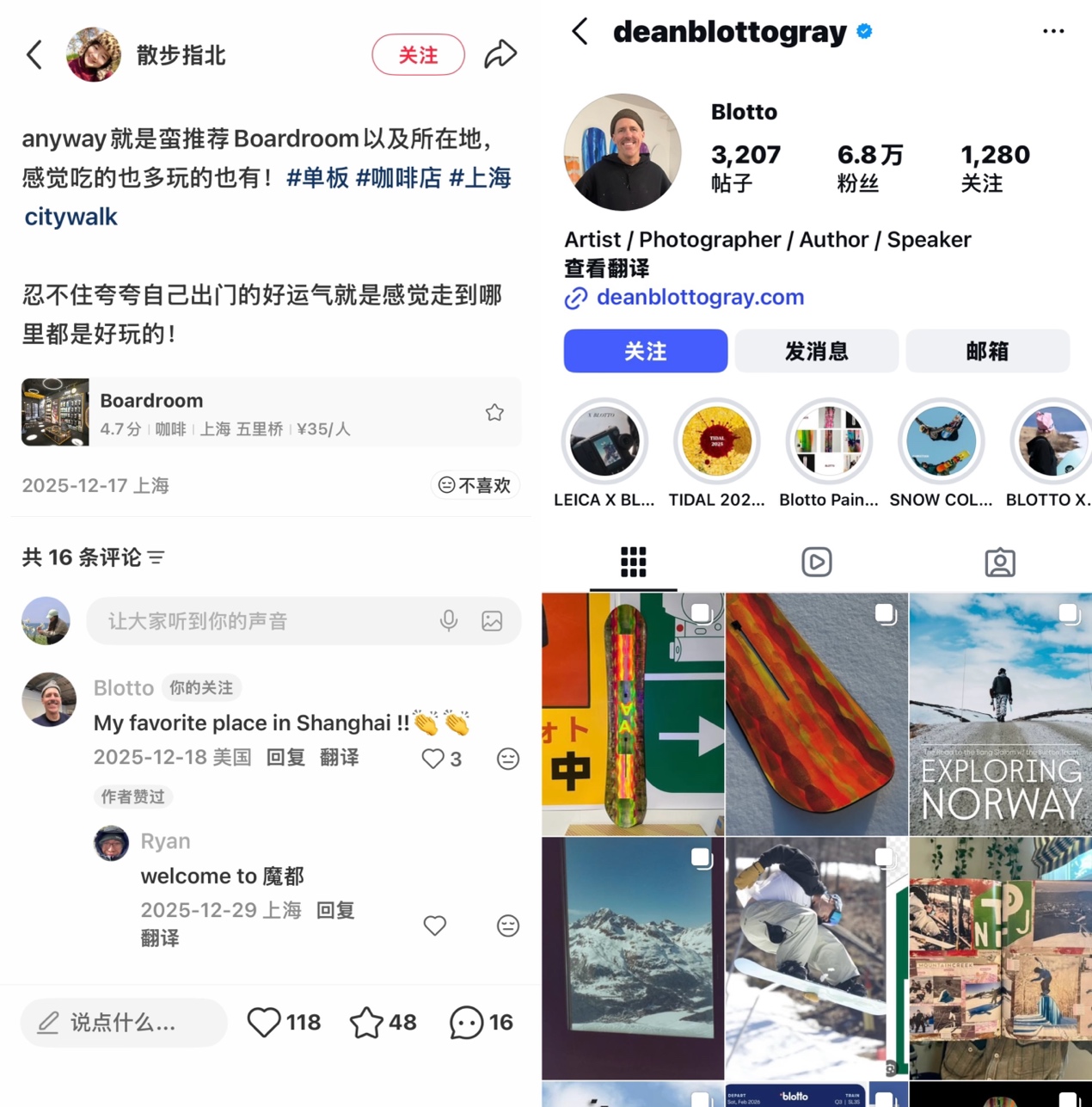 Boardroom已成为不少滑雪爱好者来沪打卡的固定一站。界面新闻注意到,有美国滑雪爱好者在相关帖子下留言称:“My favorite place in Shanghai”。