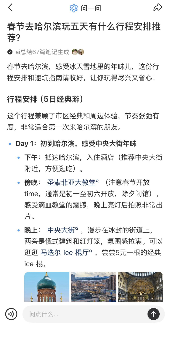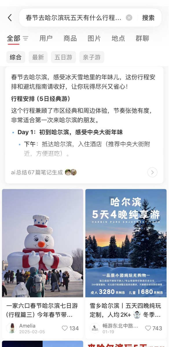 比如,当界面新闻搜索“春节去哈尔滨玩5天有什么形成安排推荐?”的问题时,平台在10秒之内完成了AI总结,用较为清晰的文字排版呈现出5天的行程安排。除了行程安排之外,AI总结的答案还加上了“春节特别提醒”,涵盖交通、美食推荐等细化建议。而在收尾处,该答案也附上了参考来源,这些来源笔记皆可点开一一查看。