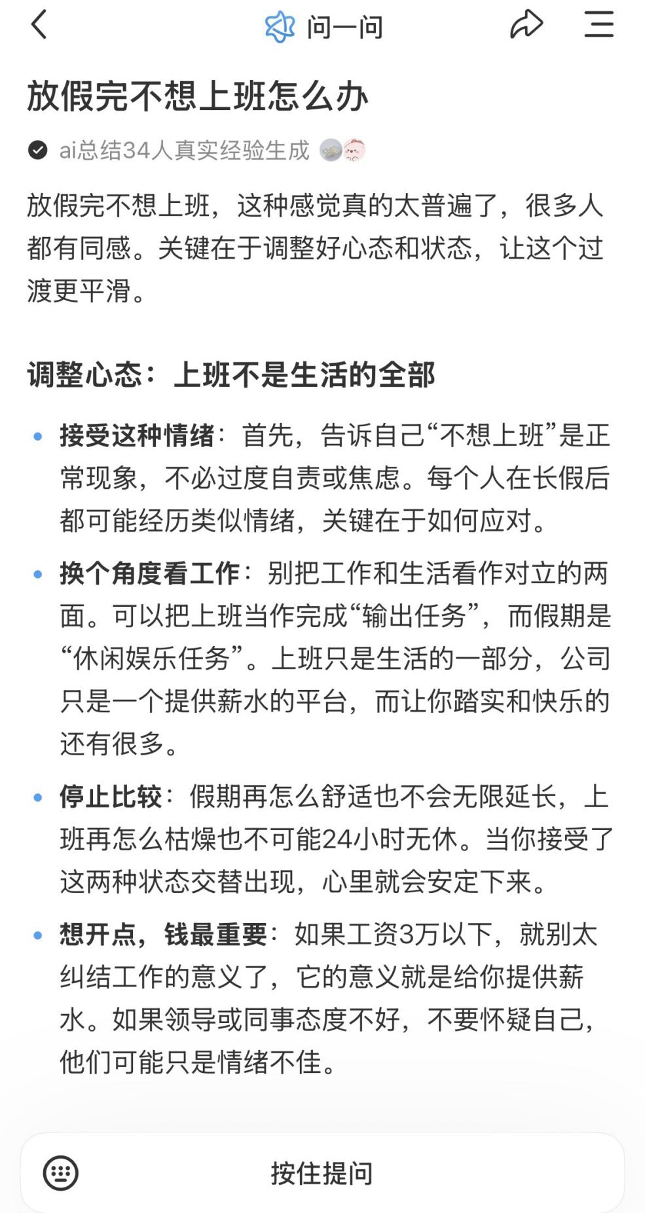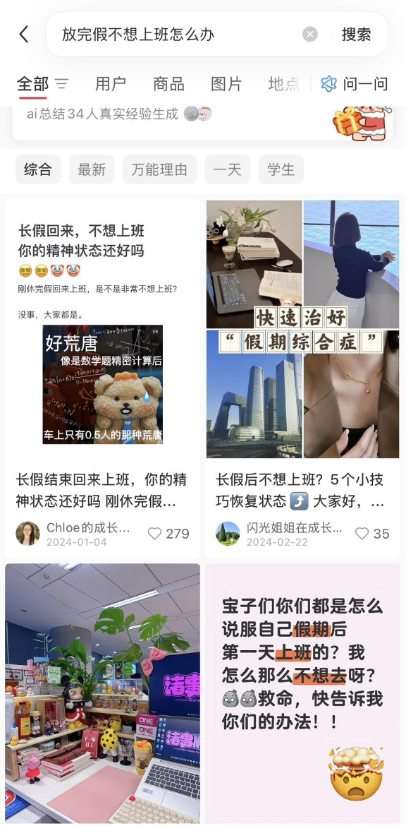 而另一类更具“生活感”、强调个体主观看法的问题,同样是符合小红书用户需求的提问。界面新闻试着使用“语音问一问”搜索“放假完不想上班怎么办?”的问题时,小红书结合了34篇笔记生成了一份AI总结,包括“调整心态”、“行动起来”、“如果真的无法忍受”等具体的答案。