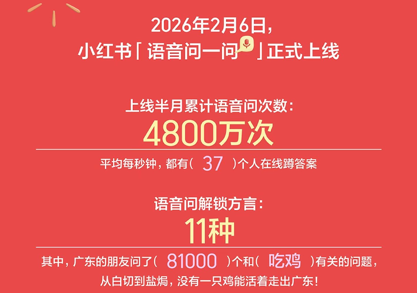 然而就是在这“碰撞”之中,小红书近期交出了第一份尝试的答卷——“语音问一问”功能上线半个月,社区语音问一问累计次数达4800万次,平均每秒钟都有37个人在线蹲答案。除夕当天“拜年祝福怎么发更特别”被问了570万次。
