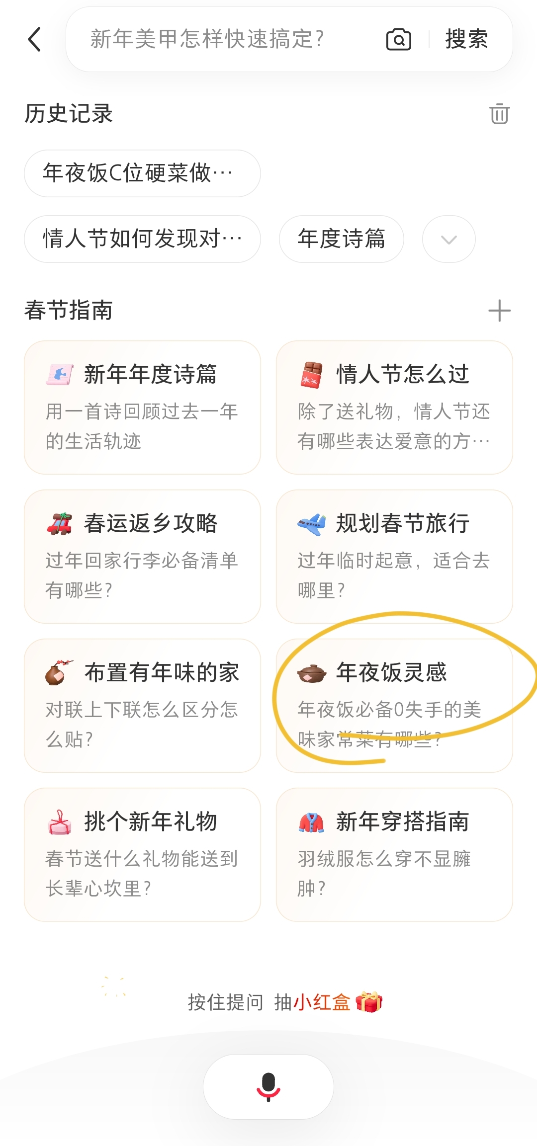 值得一提的是,小红书还在搜索入口下方推出了“春节指南”、“年度诗篇”等限定玩法,去引导用户在春节场景里尝试“语音问一问”。无论用户有没有问题,都可以通过点击提问来“逛答案”。