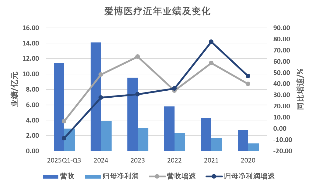 到2025年第三季度,爱博医疗利润总额同比下滑35.46%,主要原因即是人工晶状体和隐形眼镜收入下滑,以及加大隐形眼镜自有品牌推广、销售费用上升。