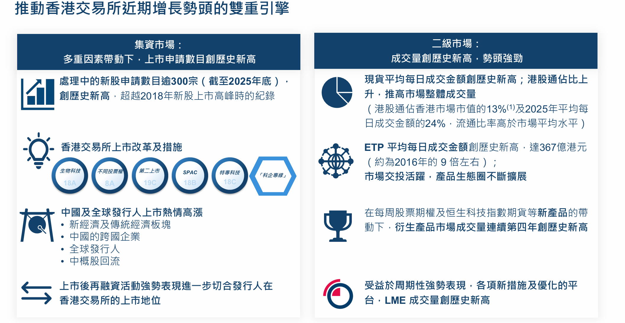二级市场层面,在人工智能及其他科技发展浪潮下,全球投资者对中国资产兴趣重燃,中国内地投资者参与度持续增加,香港现货市场2025年表现强劲,成交金额创历史新高,新股市场也气氛炽热。