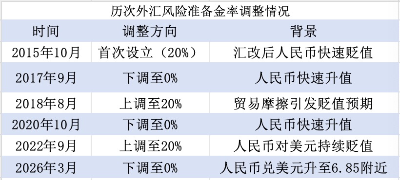 自2015年10月,外汇风险准备金率经过多次调整,呈现如下规律:当人民币贬值压力大时,上调至20%,以增加购汇成本,给贬值“踩刹车”;当人民币升值压力大时,下调至0%,以降低购汇成本,抑制升值。