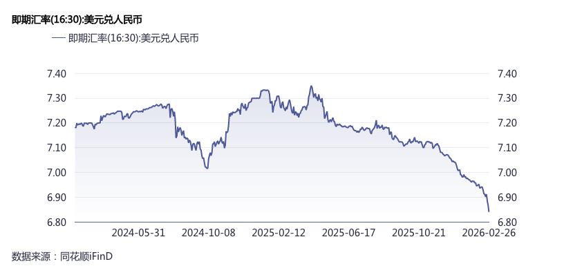 但2025年人民币汇率在中美贸易战下反而稳步升值,在2025年末升值突破7,并在今年以来呈现加速升值的态势:从7.2升值到7用了7个月(2025年5月-2025年12月,升值2000个基点),从7升值到6.83用了两个月(2025年12月-2026年2月,升值近2000个基点)。