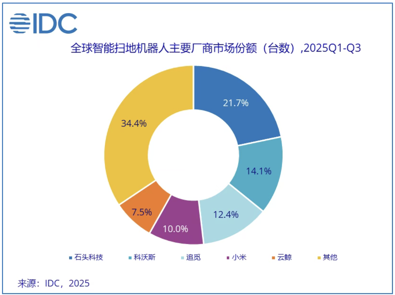 界面新闻注意到,IDC发布的《全球智能家居设备市场季度跟踪报告》显示,2025年前三季度,全球智能扫地机器人市场累计出货1742.4万台,同比增长18.7%;其中三季度出货616.1万台,同比增幅达22.9%。从厂商份额来看,中国厂商包揽全球出货量前五,分别是石头科技、科沃斯、追觅、小米和云鲸。