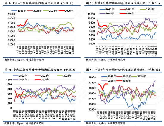 同时作为VLCC船的另外主流阵地拉美地区和西非地区出口量也呈现高位,截止2月22日四周移动平拉美和西非累计海运原油出口为900万桶/天,环比去年同期873万桶/天上涨3%。在主流发货地出口积极下,对应进口地中国和印度进口也有所反映。值得一提的是,委内瑞拉原油在美国接手后海运出口增加较为明显,随着委内出口量的合法释放(也可从在途库存增加得到印证),也即为VLCC船提供额外的运输机遇。具体详细可看20260128发布的《【航运专题】委内变量对油运市场产生的结构性调整》。
