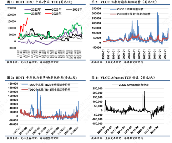 一、近期油轮运价表现:VLCC船运费市场强劲上涨:期租情绪高于即期;中东线强于美湾/西非线;大小船TCE价差创近5年新高。春节期间油轮板块引发了航运业界高度关注,其运费市场再度上演了类似2021/2024年春节跳涨行情。截止2月23日,波交所统计的标杆航线VLCCTD3C中东-中国航线即期运费录得17.6万美元/天,环比春节前2月13日12.2万美元/天跳涨44%,创下2020年4月24日以来的历史新高。