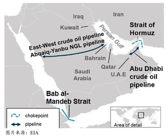 在美伊新一轮冲突爆发后,3约1日召开的OPEC会议备受瞩目,市场对4月的增产预期从13.7万/桶每日调高至41.1万桶/日。该增产量对油价的抑制作用有限,同时若霍尔木兹海峡真正关闭,并没有替代通道可以承接石油的运输工作。为应对海峡封锁风险,海湾国家建设了部分陆上输油管道作为替代,其中沙特的东西管道理论最大运力可达500-700万桶/日,阿联酋通往富查伊拉港的管道设计运力约150-180万桶/日,这些管道通常不会满负荷运行,EIA预计沙特和阿联酋管道每天约有260万桶富余容量可用,以便在供应中断时绕过霍尔木兹海峡。综合来看,现有替代管道的最大可调用运力合计不足300万桶/日,对于日均2000万桶的霍尔木兹海峡的运输来说,替代能力杯水车薪,80%以上通过霍尔木兹海峡的原油供应将面临直接中断的风险。