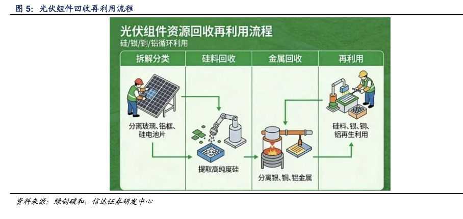 光伏组件材料中包含玻璃、硅、银、铜、铝等有价值组分。通过回收,这些物质可以被循环再利用,有效缓解生态环境压力。