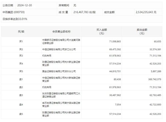 12 月 30 日,中百集团股价再度涨停,全天换手率33.01%,成交额25.34亿元。龙虎榜数据显示,机构净卖出953.42万元,营业部席位合计净卖出2.78亿元。
