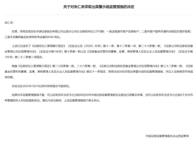 四是根据山西证监局官网所示,朱仁来在华源证券山西分公司从业期间存在三个违规,其中一个就是违规操作客户证券账户,属于“代客炒股”;另外两项违规就是向客户提供开通科创板知识测评答案,以及未完整报备实际使用所有设备的MAC地址。朱仁来被采取出具警示函的监督管理措施,并记入证券期货市场诚信档案。朱仁来要在2025年1月10日前提交书面报告。
