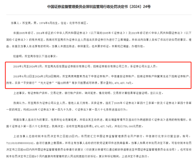 二是根据深圳证监局官网所示,证券从业人员苏宝亮2016年1月至2024年3月先后在国金证券、招商证券工作,期间借他人名义持有、买卖证券,违反了《证券法》,最终没收苏宝亮违法所得约147万元,并处以75万元罚款,合计罚没222万元。