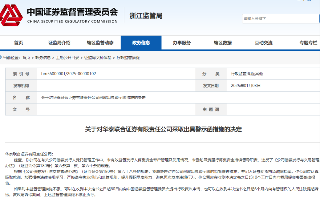 根据《公司债券发行与交易管理办法》(证监会令第180号)第六十八条的规定,浙江证监局决定对华泰联合证券采取出具警示函的监督管理措施,并记入证券期货市场诚信档案。