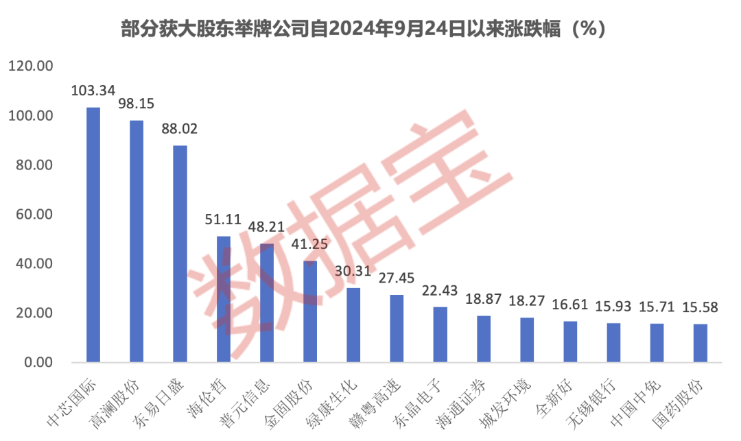 从获举牌公司(包含A股、H股,以A股表现进行统计)的市场表现来看,自2024年9月24日至2025年1月3日,20余股平均涨幅接近30%,、、东易日盛等涨幅超过80%。