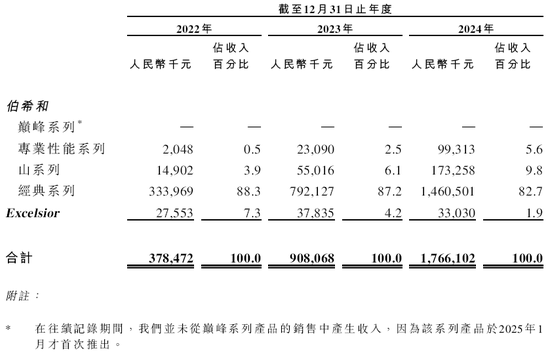 伯希和户外产品组合种类繁多,可满足男女老幼等广泛客户群的需求,适合不同季节及场合。于往绩记录期间,服装及鞋类为公司的主要产品类别,占总销售额的大部分。截至2024年12月31日,伯希和品牌的服装及鞋类产品包括572个标准产品单位(SPU)。截至往绩记录期间,伯希和品牌下建立了四个产品系列,即巅峰系列(2025年1月推出)、专业性能系列、山系列及经典系列。其中巅峰系列及专业性能系列面向专业登山者、户外探险家及户外科研人员,山系列及经典系列则面向户外运动爱好者、旅行者及城市用户。每个系列还提供一系列配套的户外装备及配饰,如登山杖和帐篷,以满足不同用户的需求。