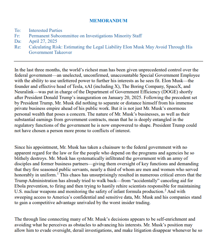 这份43页的报告由参议员理查德布卢门撒尔(康涅狄格州民主党人)领导参议院常设调查小组委员会的民主党工作人员撰写,是迄今为止最详尽的指责,详细描述了马斯克作为特朗普顾问和DOGE团队的主要推手所涉嫌的利益冲突。