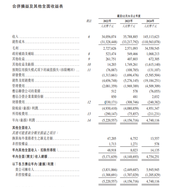 招股书显示,在过去的2022年、2023年、2024年,赛力斯的营业收入分别人民币340.56亿、357.89亿和1,451.14亿元,相应的净利润分别为人民币-52.21亿、-41.57亿和47.40亿元。