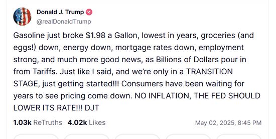 北京时间5月2日晚间,美国总统特朗普周五在一份强于预期的4月就业报告发布后,再次呼吁美联储下调利率。