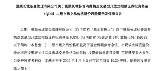 1月8日晚,景顺长城基金公告称,近期,景顺长城标普消费ETF二级市场交易价格明显高于基金份额参考净值,出现较大幅度溢价。特此提示投资者关注二级市场交易价格溢价风险,投资者如果盲目投资,可能遭受重大损失。为保护投资者利益,基金将于1月9日开市起至当日10:30停牌。