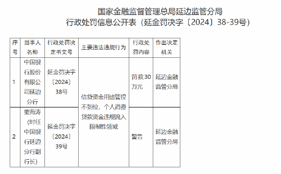 1月9日金融一线消息,国家金融监督管理总局延边监管分局行政处罚信息公开表显示,股份有限公司延边分行因信贷资金用途管控不到位,个人消费贷款资金违规流入限制性领域,被罚款30万元;姜海涛(时任中国银行延边分行副行长)被警告。