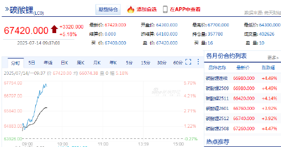 快讯:2025年7月14日,主力合约涨超5%,现报67420元/吨。